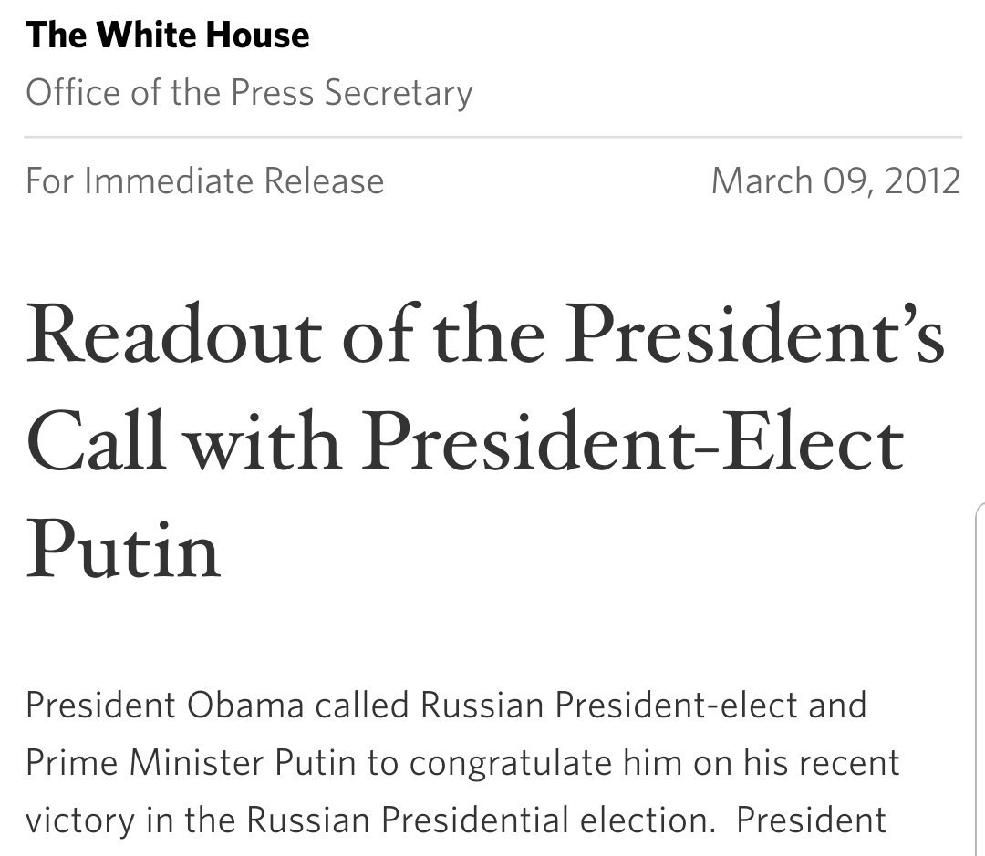 “President Obama called Russian President-elect and Prime Minister Putin to congratulate him on his recent victory in the Russian Presidential election,” the White House said in a late Friday afternoon statement (read: news dump) about the Friday morning phone call between the two leaders.