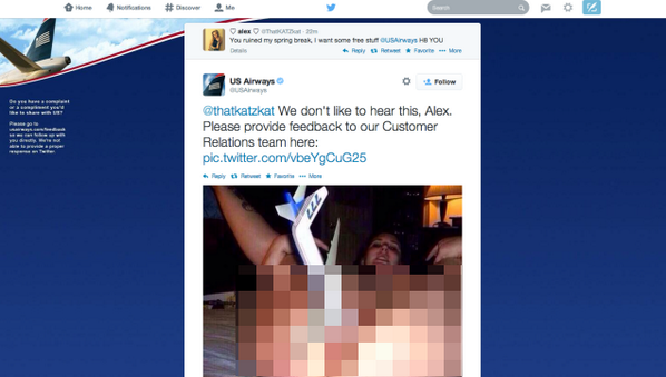 US Airways tweeted then deletes woman sticking toy 777 up her vagina. Below is a screen shot of the tweet with the vagina pixelated.
