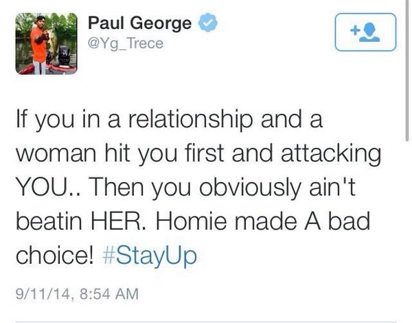 Paul George of the NBA’s Indiana Pacers tweeted his supporter for woman beater Ray Rice. He also (as usual) made the issue about race on his Twitter account claiming ‘They crackin down on breh!’. Then he compared the outrage over Ray Rice beating his wife/girlfriend to ‘police violence” in an obvious attempt to distract from Rice and show sympathy for Michael Brown in Ferguson.