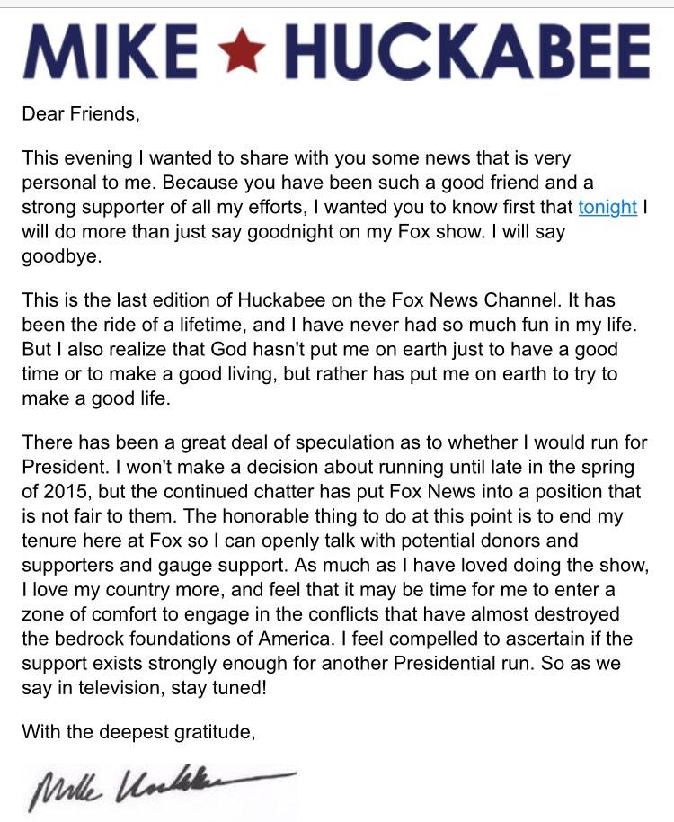 “There has been a great deal of speculation as to whether I would run for President. If I were willing to absolutely rule that out, I could keep doing this show. But I can’t make such a declaration. I won’t make a decision about running until late in the spring of 2015, but the continued chatter has put Fox News into a position that is not fair to them nor is it possible for me to openly determine political and financial support to justify a race. The honorable thing to do at this point is to end my tenure here at Fox. As much as I have loved doing the show, I cannot bring myself to rule out another Presidential run. So as we say in television, stay tuned!”