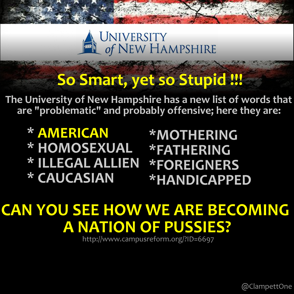 According to the University of New Hampshire bias-free language guide, the word ‘American’ is considered offensive. Why is American considered offensive? According to the University of New Hampshire bias-free language guide says American offensive because “the U.S. is the only country in North and South America.” Also considered ‘offensive’ by the loons at the University of New Hampshire and their bias-free language guide is ‘mothering and fathering.’