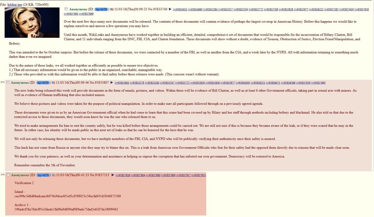 One poster, who claims to have affilation with Wikileaks claims that starting later today, and all the way through the election, Wikileaks document dumps will reveal the biggest coverup in America history.