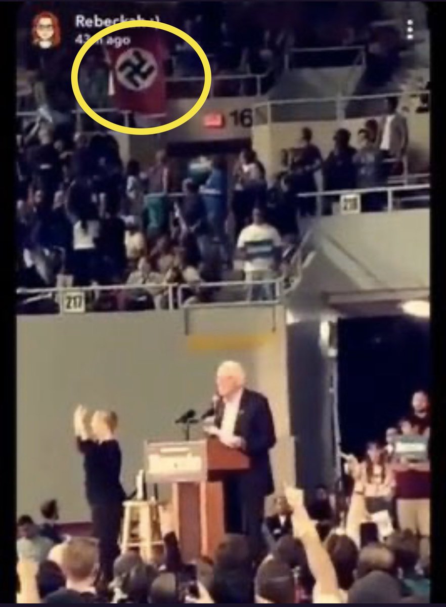 Nazi flag at Bernie Sanders rally: The socialist policies of the Nazis mirror Bernie's. So does the antisemitism of the Democrat party. https://t.co/1TJcUdeR06 pic.twitter.com/72o0vdHh4d
