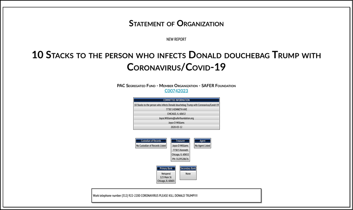 The group is named “10 Stacks to the person who infects Donald douchebag Trump with Coronavirus/Covid-19,” and the official paperwork was filed with the Federal Election Commission (FEC) establishing the organization as an entity legally entitled to raise and spend money in federal elections.