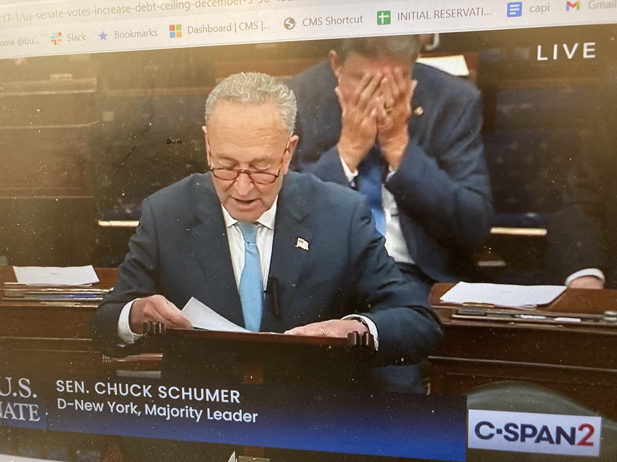 VIRAL MOMENT: Last night after the debt ceiling was extended, Senate Majority Leader Chuck Schumer (D-NY) slammed Republicans on the Senate floor, and behind him, Sen. Joe Manchin (D-WV) looked visibly upset. pic.twitter.com/AmUUiZ53Gn