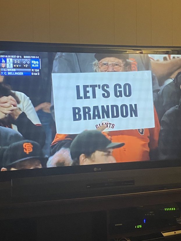 Just made my night. Dodgers v Giants game and scanning the Crowd, a woman holding up a Sign “Let’s Go Brandon”!