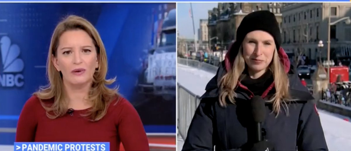 On Monday afternoon, MSNBC anchor Katy Tur feared a protest by Canadian truckers against government COVID regulations was tantamount to a “national insurrection.” She then brought on a Canadian journalist who detailed the threats posed by the demonstrators: Plinko, pizza ovens, saunas, and hot tubs.