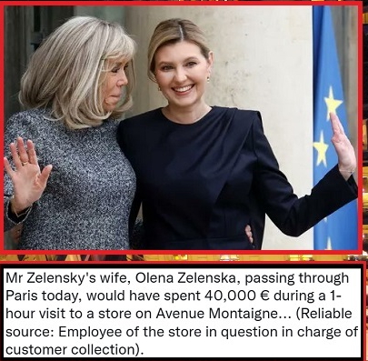 However, social media has erupted today after a “reliable store clerk” working on the ritzy Avenue Montaigne, has reported that Olena Zelenska went on a Christmas shopping spree spending €40,000 euros in an hour. (citation) Previously President Zelenskyy’s wife was received by French first lady Bridget Macron.