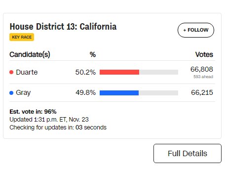 There is still one house race still not “officially” called after the election three weeks ago. That is California’s 13th